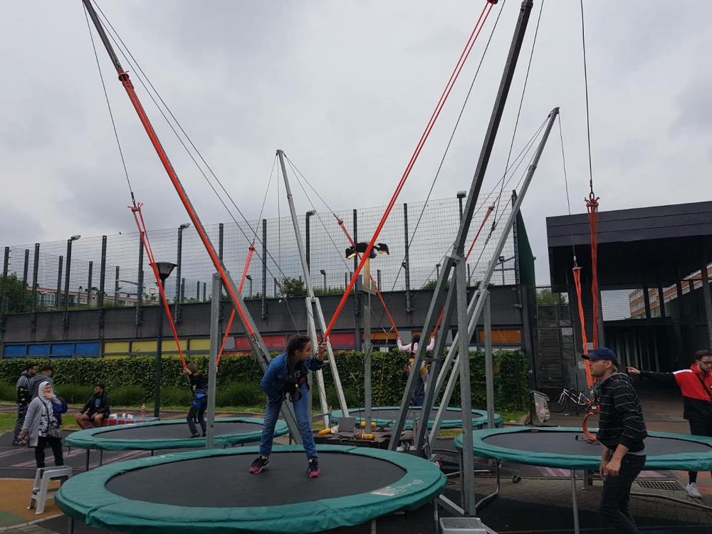 Pour ajouter de la hauteur à votre évènement, nous vous proposons la location de trampoline élastique, avec une hauteur de voltige de 6 mètres.